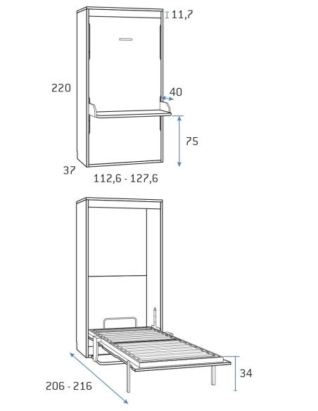 4. Cama abatible vertical con cama de 105 x 200 cm:    ↔ 127,6 cm ↗ 37 ↕ 220 cm / Sin altillo  / Abierta ocupa 216 cm.