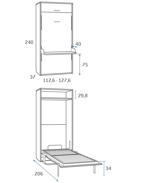 6. Cama abatible vertical con cama de 105 x 190 cm:    ↔ 127,6 cm ↗ 37 ↕ 240 cm / Con altillo / Abierta ocupa 206 cm.