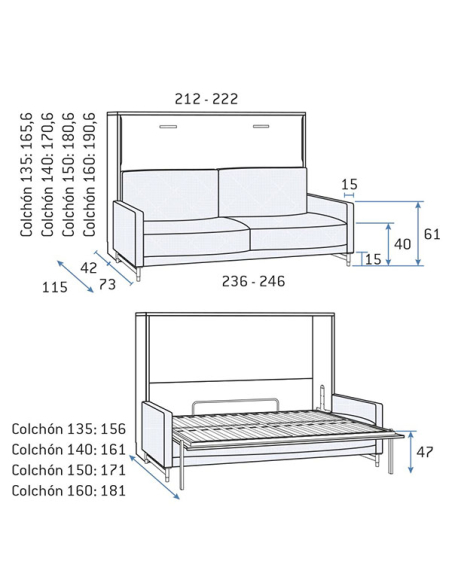 1. Cama abatible horizontal con cama de 135 x 190 cm:     212 cm  ↗ 115 cm (42+73)  ↕ 165,6 cm - Abierta ocupa 156 cm.