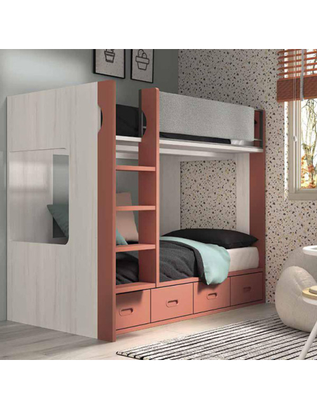 Si estas buscando amueblar la habitación juvenil de forma divertida y que haga las delicias a tu hij@, te proponemos esta cama litera bicolor con quitamiedos con formas, escalera al suelo y cuatro contenedores. Posibilidad de hacer la combinación de colores y tiradores que más te gusten dentro de la amplia gama que ofrece el fabricante.
