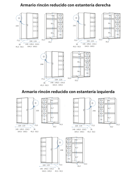 Armario juvenil de rincón reducido con estantería y puerta batiente, disponible en medida de 73,5 cm por un lado y por el otro en medidas de 149,5, 154,5, 164,5 y 169,5 cm, y tres alturas, 220, 240 y 248 cm, combinables entre sí. Echa un vistazo a los acabados para las puertas y combínalo con el acabado que más te guste.