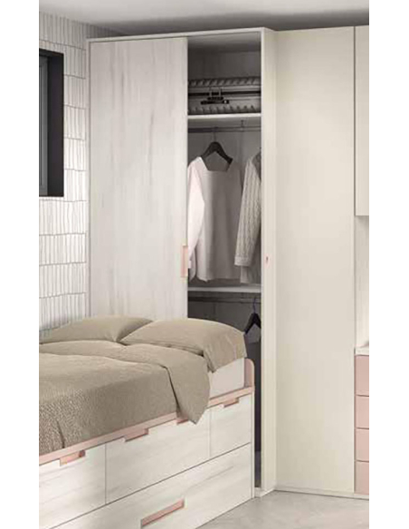 Práctico armario juvenil de rincón reducido con estantería y puerta "L" batiente, con interior compuesto por estante maletero y dos barras de colgar y en esterior estantería. Aprovechar el espacio al máximo es posible con estos armarios de rincón.