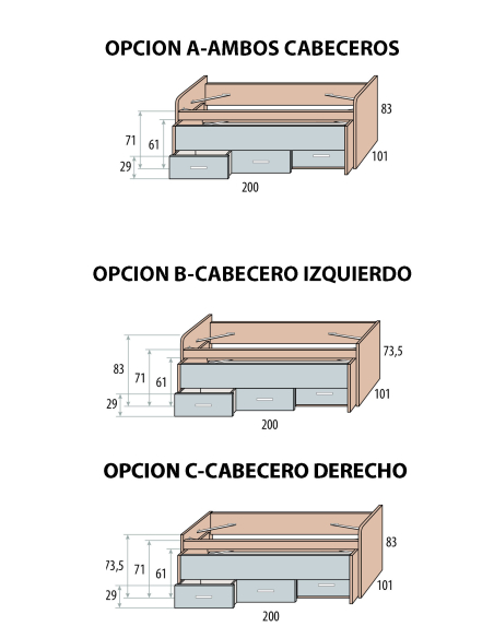 - Opción B tiene el cabecero izquierdo alto y el derecho bajo en caso de unirlo a otra pieza como un armario o un escritorio ya que podría quedar todo corrido y con un mejor aspecto visual.