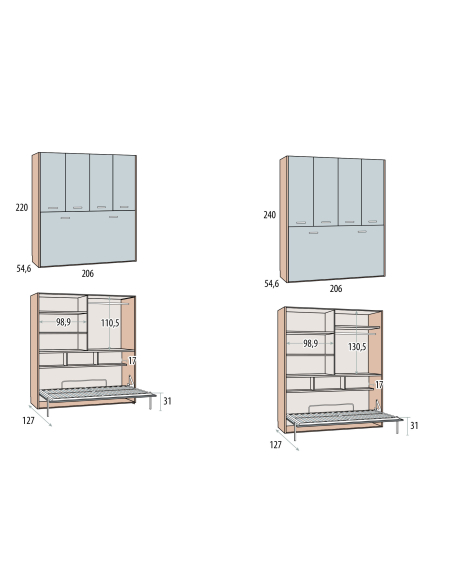 ↔ 206 cm ↗ 54,6 cm ↕ 240 cm / la cama abierta ocupa 127 cm