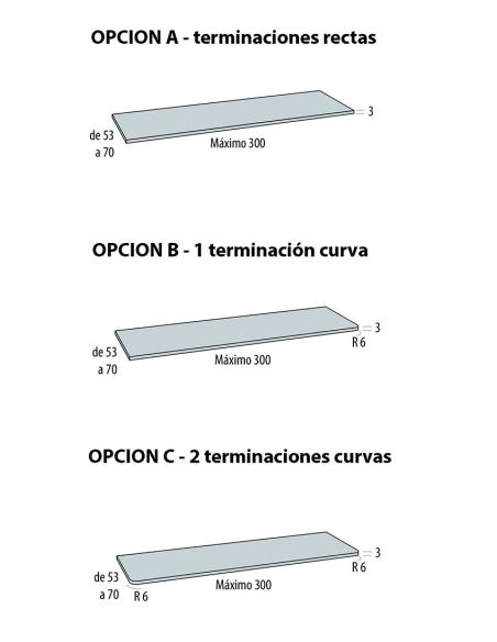 Indicar en el pedido la medida exacta de fondo de 53 a 70 cm y de largo hasta 300 cm.