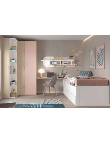 Composición habitación juvenil W-002 compuesta de armario de rincón, armario terminal, cama compacta con cama nido y 3 contenedores, estantería Jolin, arcón lateral y encimera escritorio de 193 cm.