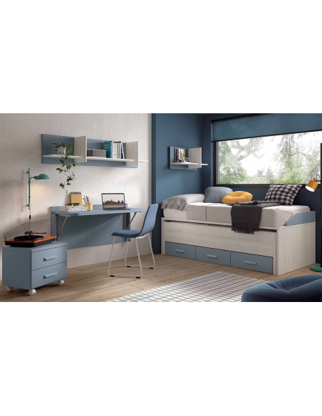 En nuestra búsqueda de la habitación juvenil perfecta, presentamos esta Habitación Juvenil Win Basic 007 compuesta por zona de descanso y estudio. Todo organizado y con espacio para estudiar y tener todo en orden con dos estanterías colgantes de pared. Una cama compacta Basic para colchón de 90x190 cm con cama nido para colchón de 90x180 cm y 3 cajones bajos para cuando venga algún amig@ a dormir que harán las delicias de los pequeños y se completa con una mesita de dos cajones con ruedas y mesa de estudio colgada abatible. Una habitación sencilla y a la vez completa. Una habitación diseñada para satisfacer todas las necesidades de los adolescentes combinando funcionalidad con diseño contemporáneo, creando un espacio que inspira la creatividad y el confort.