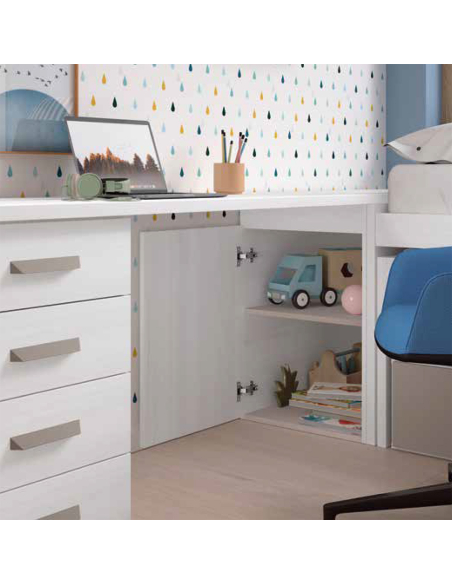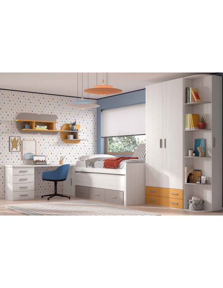 Una habitación completa con un armario de dos puertas, estantería terminal, cama compacta Basic largueros para colchón de 90x190 cm con nido oculto para colchón de 90x180 cm con 3 contenedores con guías en la parte inferior, estanterías y se completa con un escritorio con bajo mesa de cuatro cajones y arcón lateral en el lado del cabecero de la cama. Una habitación sencilla y a la vez completa diseñada para satisfacer todas las necesidades de los adolescentes combinando funcionalidad con diseño contemporáneo, creando un espacio que inspira la creatividad y el confort. Todo organizado con espacio para estudiar y con cama adicional para cuando venga algún amig@ a dormir, una habitación que hará las delicias de los pequeños,