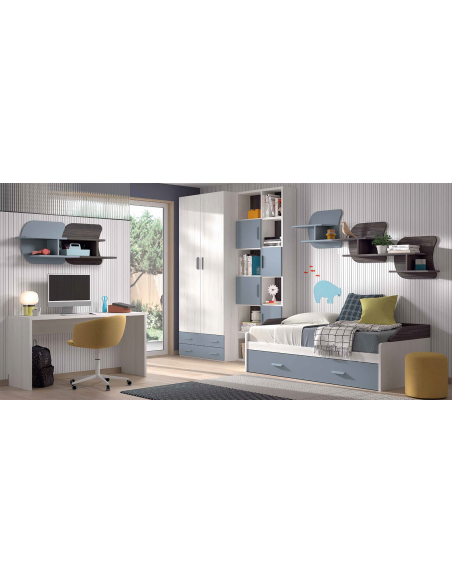 Composición habitación juvenil W-021 compuesta por armario 2 puertas 2 cajones, cama nido Basic con somier de arrastre, estanterías Join, librería modular 2 cuerpos y mesa de estudio salva rodapié Basic.