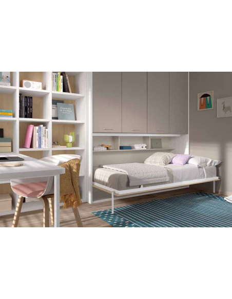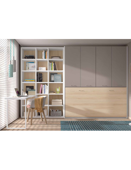 Composición habitación juvenil W-022 compuesta por cama abatible horizontal con armario puertas batientes, librería modular 3 cuerpos y zona escritorio con pata metálica.