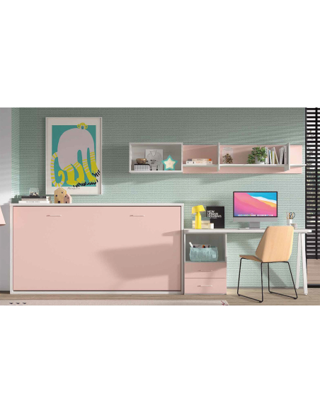 Transforma la habitación en un espacio versátil y eficiente con esta habitación que incluye una cama abatible horizontal de 90x190 cm de 42 cm de fondo, estanterías y escritorio con bajo mesa 2 cajones y hueco y pata metálica. Esta solución de mobiliario esta diseñada para aprovechar al máximo cada centímetro de tu habitación.