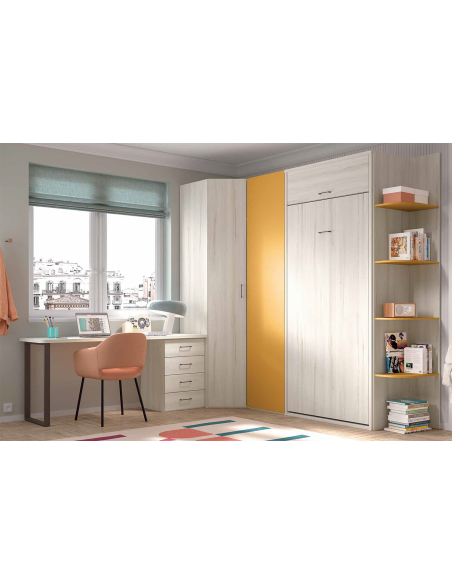 Composición habitación juvenil W-025 compuesta por cama abatible vertical con altillo, armario rincón chaflán-recto, estantería terminal y escritorio con cajonera y pata metálica.