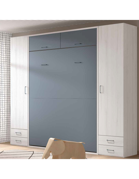 Composición habitación juvenil W-026 compuesta por cama abatible 135x190 cm vertical con altillo, armario 1 puerta 2 cajones izquierdo y armario 1 puerta 2 cajones derecho.