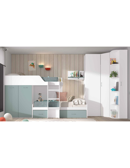 Composición habitación juvenil W-028 compuesta por cama block con dos camas y armario, armario de rincón chaflán-recto, armario terminal con estantes y estantería.