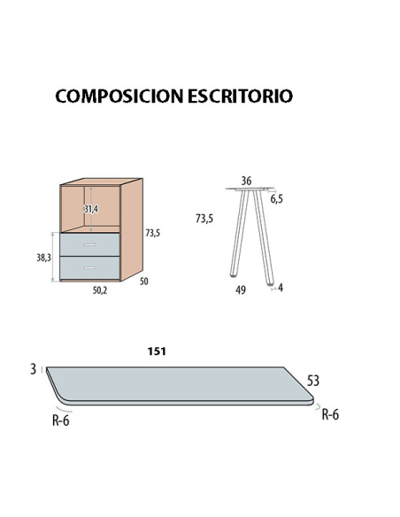 Bajo mesa dos cajones: ↔ 50,2 cm ↗ 50 cm ↕ 73,5 cm