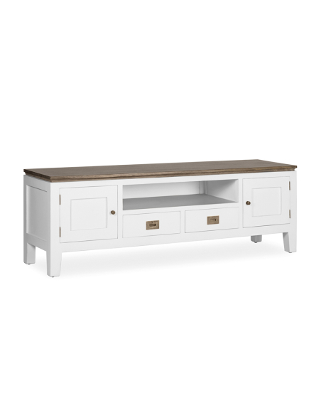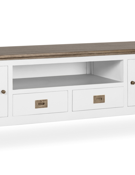 El estilo sencillo y liso de esta colección hace de este mueble de TV Everest una pieza diferente que aportará a tu hogar luz y calidez. Se trata de un mueble compuesto de dos pequeños armarios a los lados y un pequeño hueco en el centro, en el que poder colocar los aparatos electrónicos, con dos cajones debajo. Cuenta con una encimera en un tono oscuro que le da al producto un toque de contraste que combina a la perfección con la pieza crean un conjunto especial. Los tiradores tienen acabado en bronce a juego con los tonos de la pieza y creando un mueble completo. Además cuenta con patas para que no haya problema a la hora de limpiar.