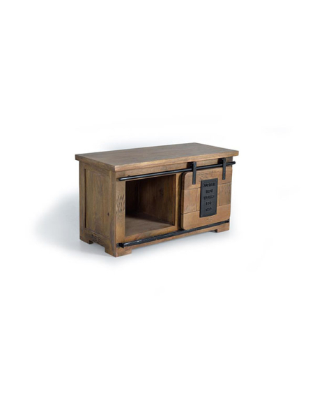 Mueble TV Acra en madera de mango de estilo industrial con puerta corredera y detalles en metal.
