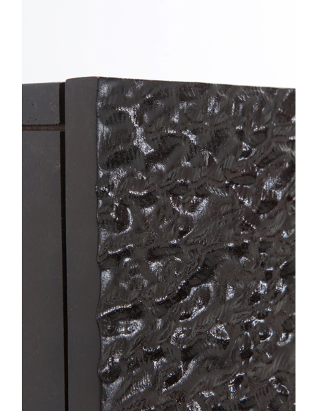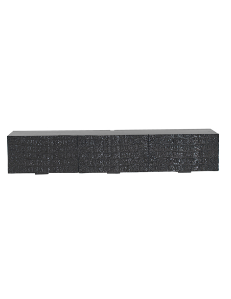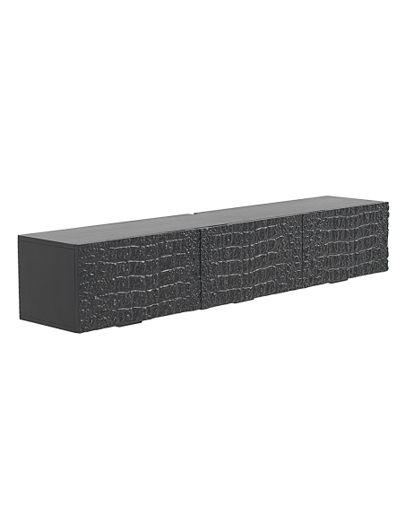 Mueble TV Orza 4 puertas madera imitación piel coco, este mueble bajo destaca por sus dos puertas frontales revestidas en una llamativa imitación de piel de cocodrilo en color negro, realzada por un sofisticado acabado con alto brillo que refleja la luz y añade un toque de glamour. Fabricado con madera de mango robusta, este mueble no solo es un elemento decorativo impactante, sino también una solución funcional y duradera para organizar tu espacio de entretenimiento. Diseñado inteligentemente para colgar en la pared, incluye tornillería y soportes. El mueble TV Orza libera espacio en el suelo y crea una estética moderna y despejada. Tras sus texturizadas puertas, encontrarás tres compartimentos interiores separados, ideales para guardar dispositivos electrónicos, mandos a distancia, películas o cualquier otro accesorio que desees mantener ordenado y oculto. Las bisagras de cierre suave aseguran un uso cómodo y silencioso en el día a día. Este mueble TV es la elección perfecta para salones contemporáneos, modernos o con un toque de lujo. Su textura exótica de cocodrilo en negro brillante lo convierte en un punto focal indiscutible, combinando a la perfección almacenamiento práctico con un diseño vanguardista. Eleva la decoración de tu zona de televisión con esta pieza única y funcional.