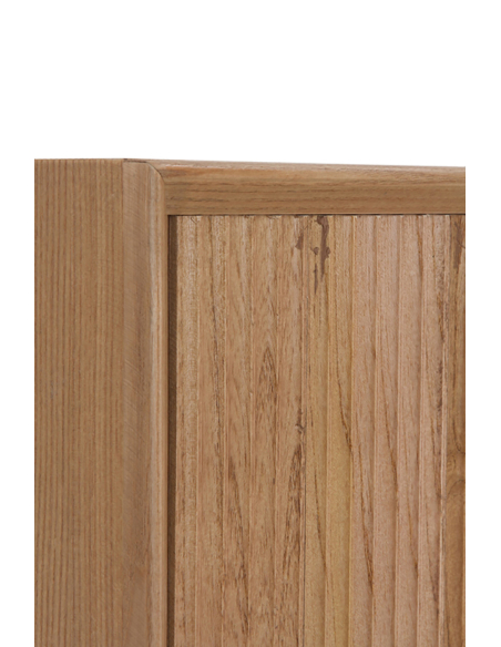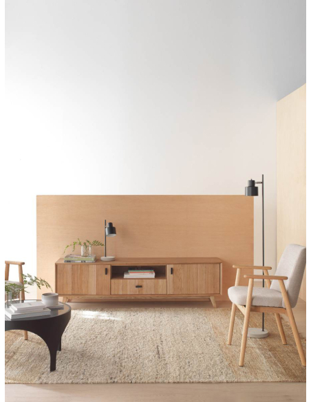Mueble TV Timón 2 puertas 1 cajón chapado en fresno, este mueble combina la calidez del chapado en madera de fresno natural con el toque moderno de sus patas y tiradores metálicos en negro. Su diseño se distingue por los frentes acanalados en las dos puertas y el cajón central, un detalle texturizado que aporta carácter y sofisticación al conjunto, encajando perfectamente en decoraciones modernas o de inspiración nórdica. Detrás de su atractivo diseño, el Mueble TV Timón ofrece soluciones prácticas de almacenamiento. Cuenta con dos compartimentos laterales cerrados por puertas y un amplio cajón central, ideal para guardar dispositivos electrónicos, cables, mandos y otros accesorios, manteniendo el orden en tu salón. Las bisagras de cierre suave en las puertas aseguran un uso cómodo y silencioso, añadiendo un plus de calidad al mueble. Con unas dimensiones adecuadas para la mayoría de televisores, este mueble no solo soporta tu pantalla, sino que también realza la estética de tu salón. La combinación del fresno natural, el diseño acanalado y los detalles en negro crea una pieza equilibrada y actual.