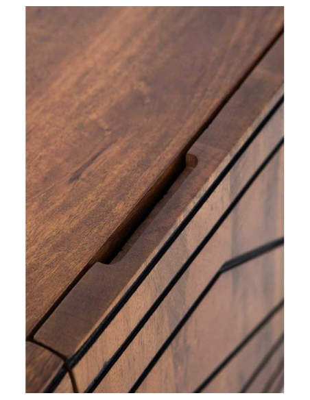 Mueble TV Nácar 2 puertas 2 cajones, fabricado en madera maciza de mango con frente tallado en líneas geométricas, que aporta un estilo moderno y sofisticado a tu salón. Sus 2 puertas con bisagras de cierre suave e imán de seguridad y 2 cajones amplios ofrecen un almacenamiento práctico y seguro para tus dispositivos y accesorios. Los pies metálicos en forma de U de 10?cm con regulador de altura brindan estabilidad y diseño contemporáneo, convirtiéndolo en un mueble funcional y elegante, ideal para cualquier espacio que busque combinar estética y orden.
