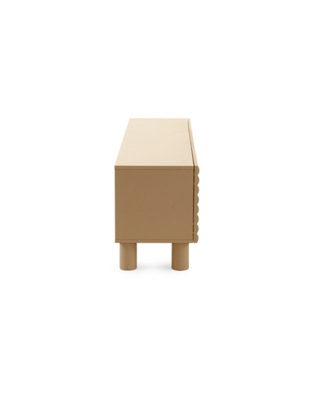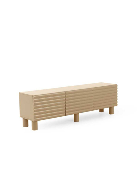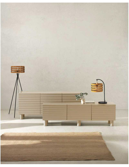 Mueble TV Perla arena, es una pieza que combina diseño elegante y máxima funcionalidad, pensado para complementar cualquier ambiente con un estilo moderno y cálido. Su frente con 3 puertas de relieve ondulado aporta un detalle visual sofisticado, mientras que el sistema push to open permite abrir las puertas sin tiradores de manera cómoda y práctica. Las bisagras con cierre amortiguado suave garantizan un funcionamiento silencioso y seguro. En el interior, cada sección cuenta con un estante movible con tres posiciones de altura, ideal para organizar equipos de TV, consolas, libros o elementos decorativos. Las patas de madera maciza de 15,5 cm elevan el mueble, aportando ligereza visual y estabilidad al mismo tiempo. Un mueble pensado para unificar estilo, orden y confort en tu salón.