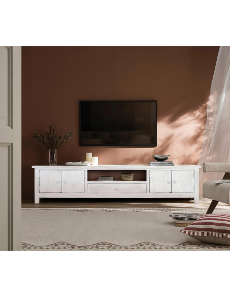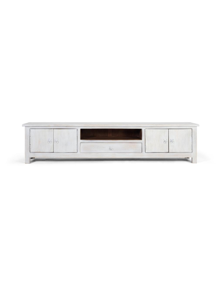 Elegante mueble TV madera mango, y muy acogedor por su material. Precioso diseño para ambientar con clase y glamour la zona del salón. Compuesto por dos puertas batientes en cada lateral, cajón central inferior y hueco central. Qué más puedes pedir para organizar todo lo que quieras con este mueble. Ideal para televisiones de amplia pantalla.