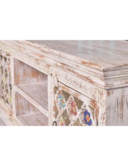Si quieres un mueble de TV que luzca de manera singular su estilo y belleza, te presentamos el mueble TV madera mango estilo floral con diseños florales en variedad de colores, con aspecto envejecido que hace que luzca un estilo muy vintage además de sus detalles de cerámica y latón. Esta compuesto por dos huecos centrales separados para aparatos electrónicos o si prefieres ser más tradicional los puedes utilizar para guardar tus libros favoritos. Además cuenta con dos puertas abatibles a los laterales, para que puedas almacenar tus películas o juegos de videoconsola. ¡No encontrarás uno igual, así que esperas a que tu hogar sea un encanto! Puedes complementarlo con una cómoda del mismo estilo para hacer el juego.