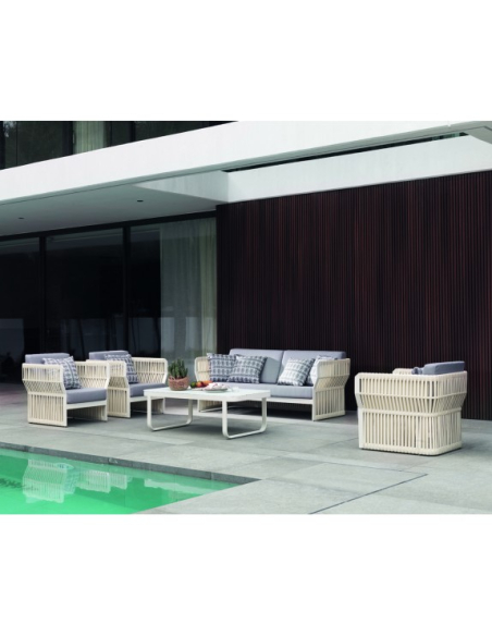 Materiales: Aluminio y fibra sintética blanca. Cojines: Desenfundables con cremallera. Tejido hidrófugo 100% acrílico repelente al agua. Telas a elegir del muestrario.