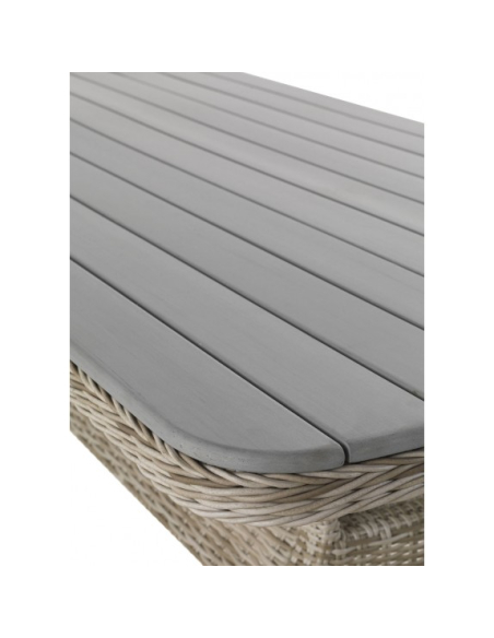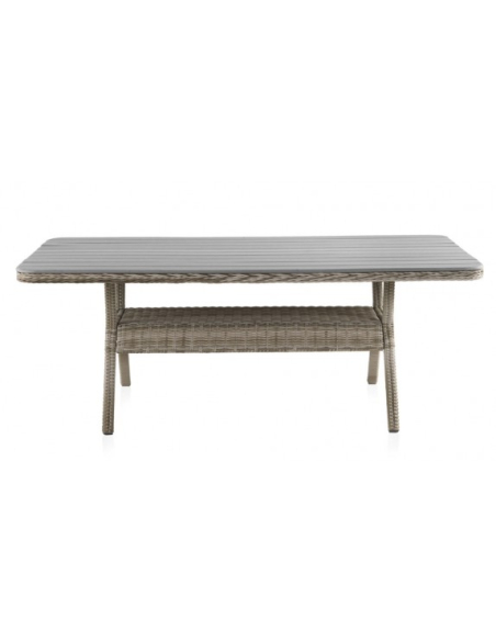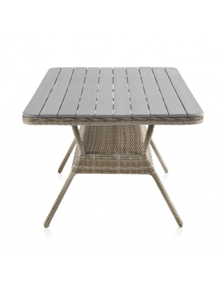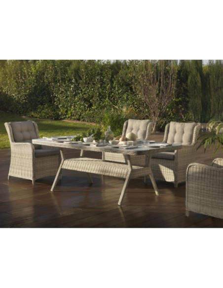 Mesa con estructura de aluminio y fibra sintética trenzada. Tablero realizado en laminas de madera sintética de 14 mm. Capacidad para 6-8 personas.