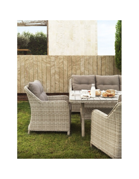Trenzado en polipropileno plano y redondo. Cojines desenfundables con cremallera. Tejido 100% acrílico repelente al agua.