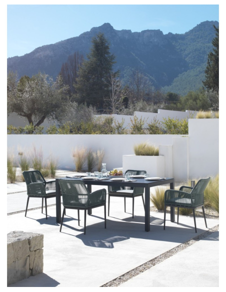 Respaldo y laterales trenzados con cuerda sintética en verde negruzco.