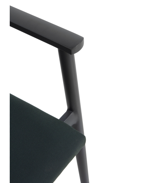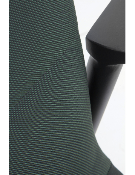 Asiento y respaldo en tela acrílica y textilene ligeramente acolchado en color verde negruzco.