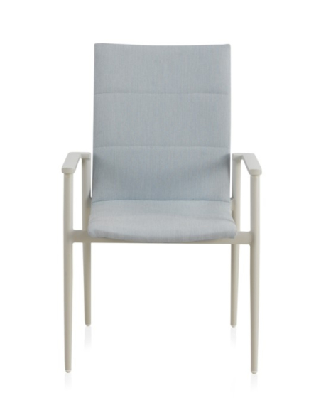 Asiento y respaldo en tela acrílica y textilene ligeramente acolchado en color azul celeste.