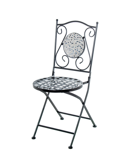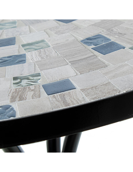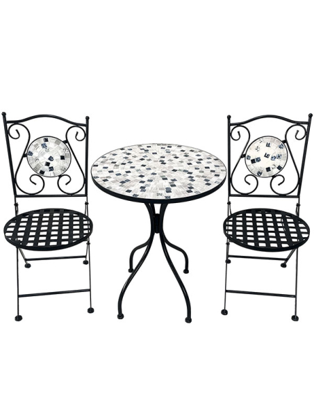 Set Miami 2 sillas y mesa hierro con piedra azul, fabricado con una estructura robusta de hierro en color negro, este conjunto se destaca por sus detalles decorativos de pequeños mosaicos cuadrados en azul y tonalidades crema, que aportan un estilo distintivo y atractivo. Las sillas, con asiento redondo trenzado, ofrecen comodidad y un diseño encantador que se integra fácilmente en cualquier ambiente. Ideal para terrazas, balcones o jardines de tamaño reducido, este set combina funcionalidad y estética, creando un espacio acogedor para disfrutar al aire libre.