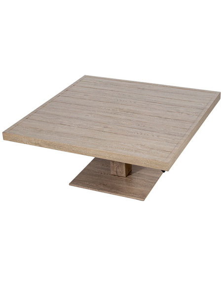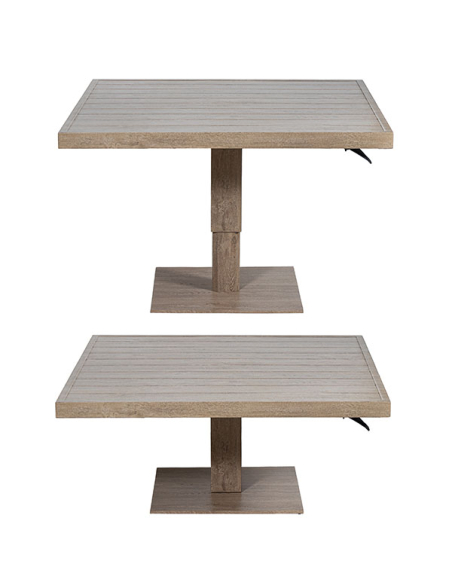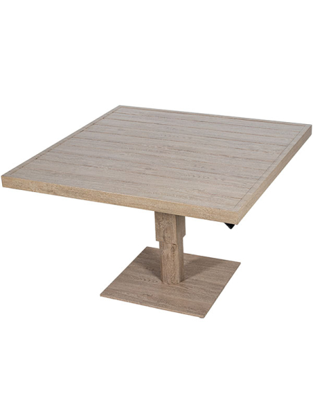Mesa Nice exterior cuadrada de aluminio crema, con altura regulable permite ajustarse a diversas actividades y necesidades, ya sea una comida informal o un rincón de lectura. El atractivo efecto madera en el aluminio le otorga un aire natural y acogedor, complementando cualquier decoración exterior. La base cuadrada más pequeña asegura una gran estabilidad, mientras que el material de aluminio proporciona durabilidad y resistencia a las condiciones climáticas, haciendo de esta mesa una opción ideal para jardines, terrazas o patios. Su fácil mantenimiento y resistencia a la intemperie la convierten en una pieza imprescindible para disfrutar de tu espacio exterior.