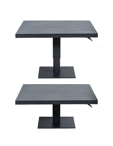 Mesa Nice exterior cuadrada de aluminio negro, ideal para diversas actividades al aire libre, esta mesa regulable se adapta con facilidad, ya sea para cenas, reuniones o como mesa auxiliar. La base cuadrada pequeña y su robusta estructura de aluminio garantizan estabilidad y durabilidad, resistiendo perfectamente las inclemencias del tiempo. La mesa no solo ofrece funcionalidad, sino que también añade un toque sofisticado a cualquier jardín, terraza o patio. Fácil de limpiar y mantener, esta mesa es la opción ideal para complementar tu espacio exterior con estilo y funcionalidad, asegurando momentos memorables al aire libre.