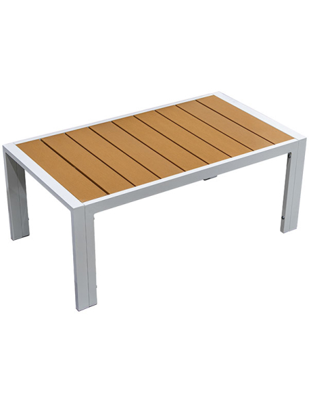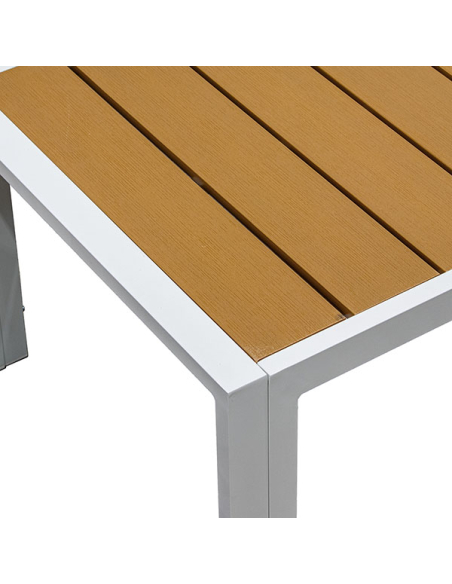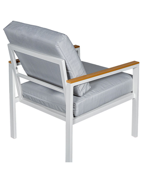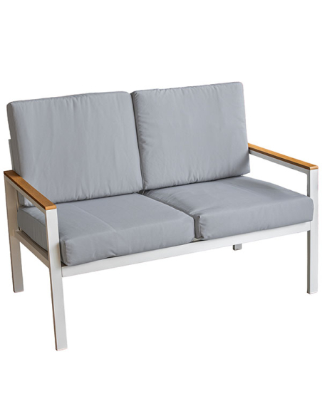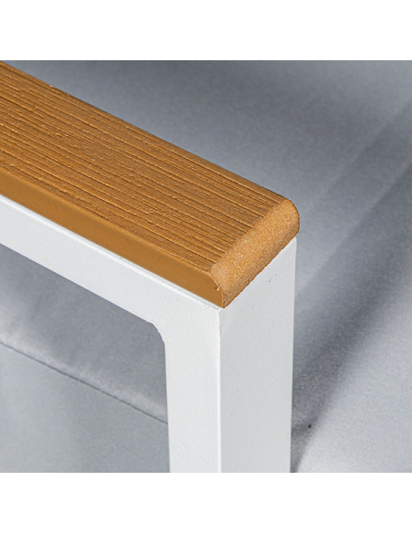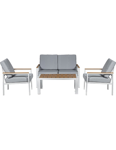 Set Cannes sofá 2 plazas, 2 sillones con mesa gris, realizados con una estructura de aluminio blanco que asegura resistencia y durabilidad. Los detalles en color madera añaden un toque rústico y cálido. Los almohadones grises son gruesos y cómodos, proporcionando un asiento confortable para largas tardes al aire libre. La mesa de centro, rectangular y funcional, cuenta con una estructura de aluminio blanco y una superficie de tablas de madera, ideal para sostener tus objetos personales o decoración. Este set es ideal para jardines, terrazas o balcones, ofreciendo un equilibrio perfecto entre estilo y funcionalidad.
