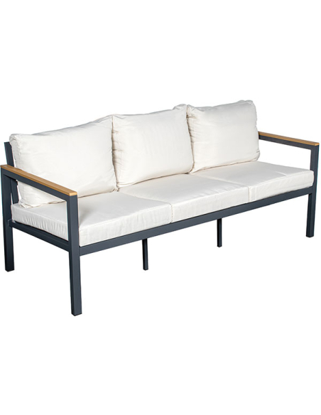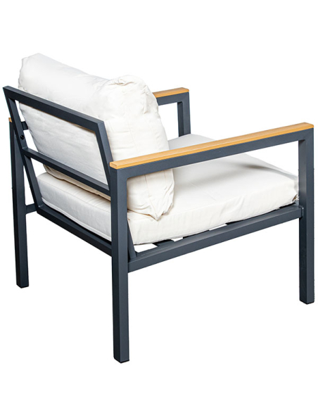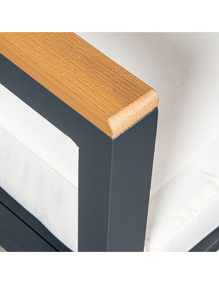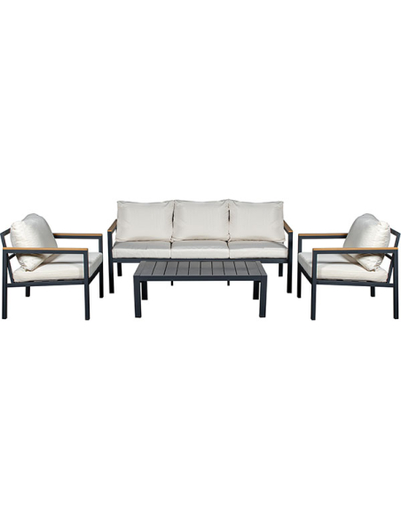 Set Cannes sofá 2 plazas, 2 sillones con mesa beige, este conjunto ofrece amplio espacio para relajarse. La estructura de aluminio negro es robusta y resistente, complementada por detalles en color madera que aportan calidez. Los almohadones beige son suaves y cómodos, ideales para disfrutar de momentos de descanso al aire libre. La mesa de centro rectangular presenta una estructura de aluminio negro y una superficie de tablas de madera, perfecta para colocar bebidas, libros o adornos. Este set no solo es funcional, sino también un elemento decorativo que realza cualquier espacio exterior.