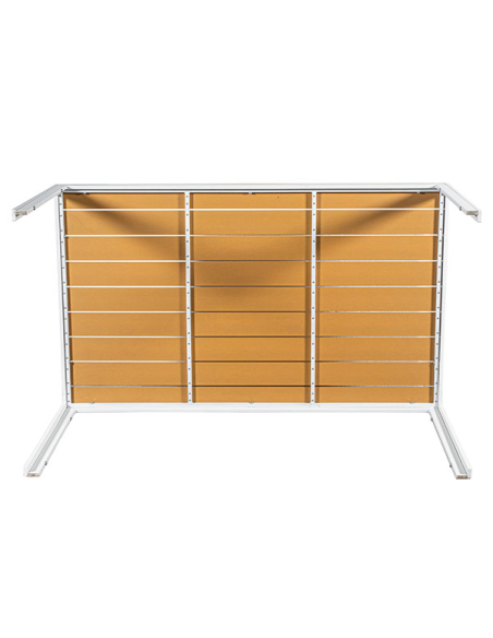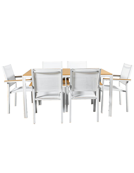 Mesa rectangular exterior blanco, su estructura está fabricada en aluminio de alta calidad en color blanco, lo que garantiza durabilidad y resistencia a la intemperie. La tapa de la mesa está compuesta por listones con efecto madera, creando un contraste atractivo y sofisticado que añade calidez al diseño moderno. Esta mesa es ideal para cenas al aire libre, reuniones familiares o simplemente para disfrutar de un café en el jardín o terraza. Con su combinación de materiales y diseño contemporáneo, aporta tanto estilo como funcionalidad a tus espacios exteriores, siendo una opción perfecta para complementar tu mobiliario de jardín.