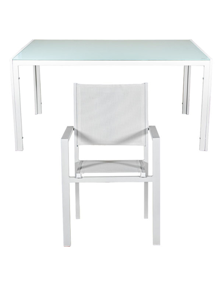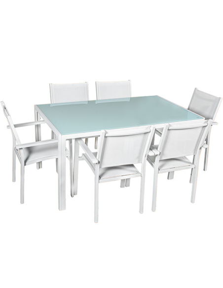 Set de comedor exterior 6 sillas aluminio blanco, la mesa rectangular cuenta con una robusta estructura de aluminio en color blanco, asegurando durabilidad y resistencia a la intemperie. Las seis sillas incluidas tienen también una estructura de aluminio blanco, combinando ligereza y solidez. Los respaldos y asientos están tejidos en textileno, un material conocido por su resistencia y confort, ideal para uso exterior. Este set no solo ofrece un diseño contemporáneo y atractivo, sino también la funcionalidad necesaria para disfrutar de comidas al aire libre con familiares y amigos. Con su combinación de materiales de alta calidad y su diseño moderno, este set de comedor es una excelente adición para cualquier espacio exterior.