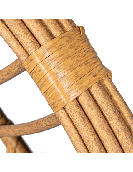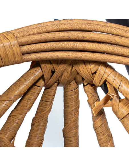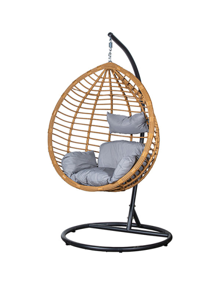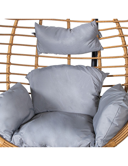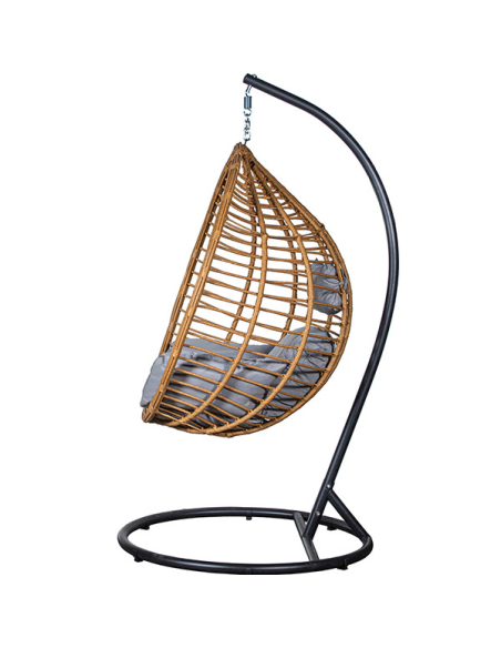 Silla colgante ratán artificial negro, su estructura metálica robusta y resistente garantiza durabilidad, mientras que el pie de color negro proporciona estabilidad y un toque moderno. La silla está forrada en ratán artificial de color natural, combinando un estilo contemporáneo con la calidez de los materiales tradicionales. El asiento viene acompañado de un almohadón mullido en color gris, que ofrece un confort excepcional para disfrutar de momentos de relajación al aire libre. Ideal para jardines, terrazas o balcones, esta silla colgante no solo es un elemento decorativo llamativo, sino también una opción práctica y cómoda para tus espacios exteriores.