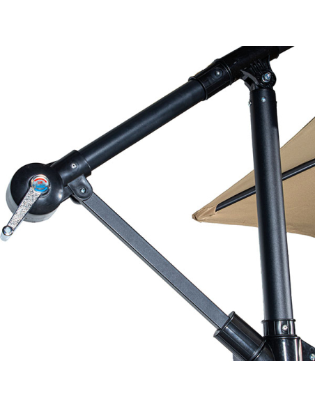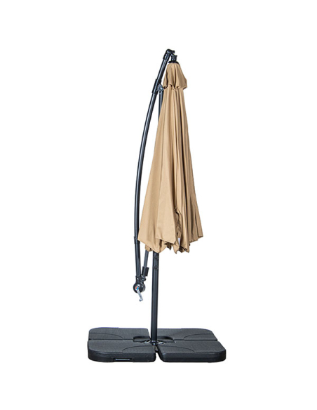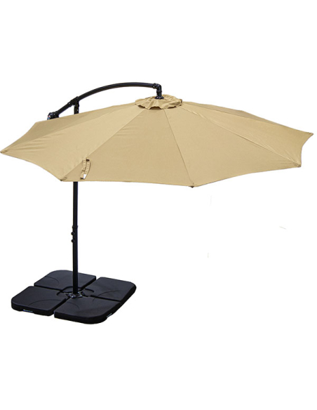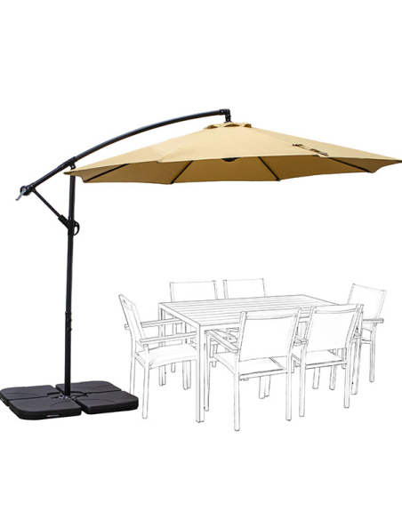 Parasol octogonal de acero y poliéster arena, su estructura de color negro proporciona estabilidad y resistencia, mientras que el sistema de apertura y cierre manual sin esfuerzo garantiza facilidad de uso. El textil de poliéster en tono arena ofrece una protección efectiva contra los rayos del sol, mientras que la abertura en la parte superior permite que circule el aire, manteniendo un ambiente fresco y confortable. Además, su diseño versátil permite girar la sombrilla 360 grados, proporcionando sombra donde más la necesitas en tu jardín o terraza.