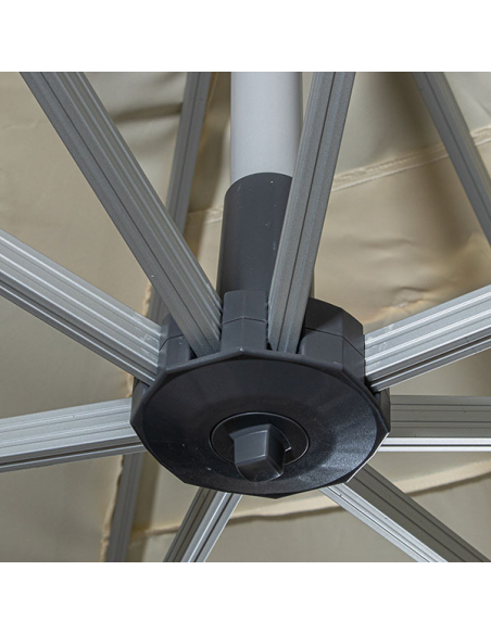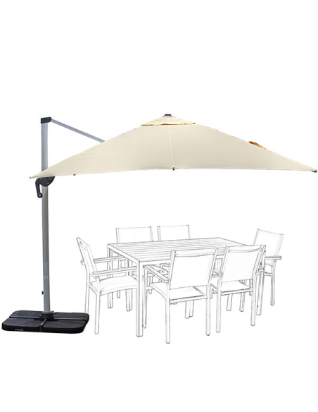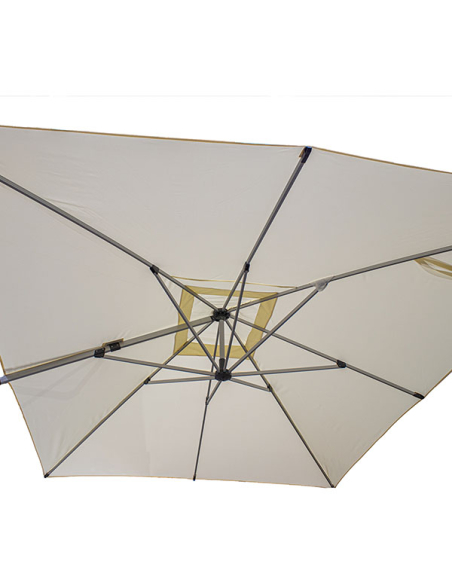 Parasol cuadrado aluminio y poliéster natural, su estructura color negro asegura estabilidad y durabilidad, mientras que el sistema de apertura y cierre manual sin esfuerzo facilita su manejo. El textil de poliéster en color natural proporciona una agradable sombra, mientras que la abertura en la parte superior permite una adecuada circulación del aire, creando un ambiente fresco y confortable. Además, su diseño giratorio de 360 grados te permite ajustar la sombra según tus necesidades, convirtiéndolo en el complemento perfecto para tu jardín o patio.