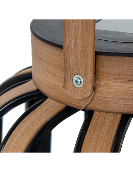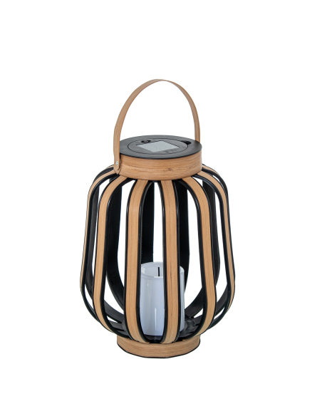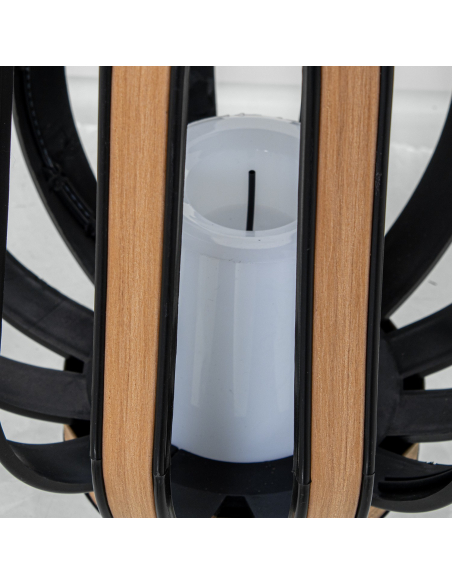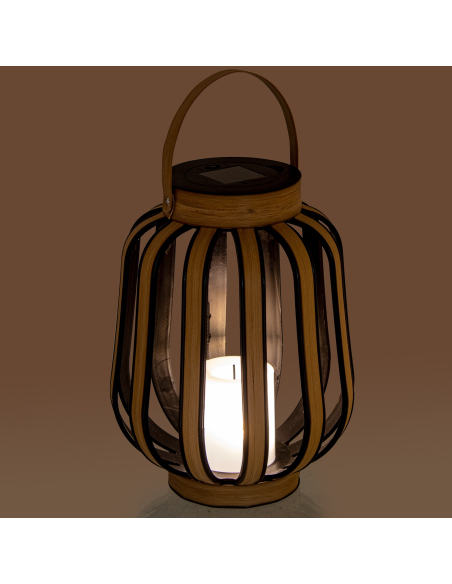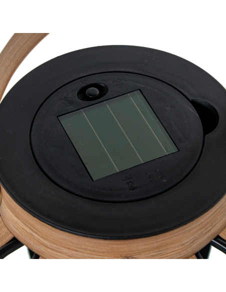 Lámpara solar sobremesa vela LED contorno, con una estructura de polipropileno y PVC de efecto madera, esta lámpara ofrece una iluminación central con vela LED y un panel solar en la parte superior. Su asa tejida de fibras naturales en color natural añade un toque rústico y elegante, haciendo de esta lámpara una opción ideal para cualquier espacio, tanto interior como exterior.