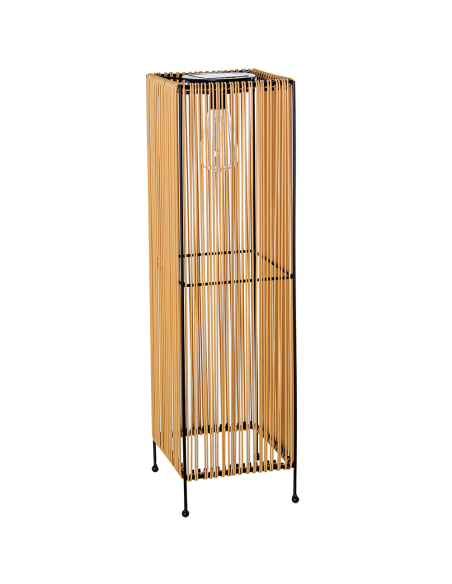 Lámpara solar pie bombilla tungsteno, su estructura de polipropileno con delgadas tiras en color negro ofrece un diseño contemporáneo y elegante. Equipada con iluminación central de luz LED y un panel solar en la parte superior para una eficiencia energética óptima. El asa de hierro facilita su transporte y manejo, asegurando versatilidad tanto en interiores como en exteriores. Todo en un sofisticado tono negro que complementa cualquier decoración.
