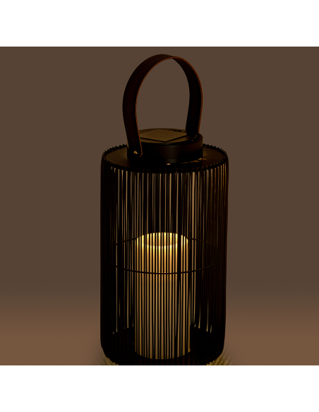 Lámpara solar pie luz LED cilíndrica, su estructura de polipropileno con delgadas tiras en color negro ofrece un diseño contemporáneo y elegante. Equipada con iluminación central de luz LED y un panel solar en la parte superior para una eficiencia energética óptima. El asa de hierro facilita su transporte y manejo, asegurando versatilidad tanto en interiores como en exteriores. Todo en un sofisticado tono negro que complementa cualquier decoración.