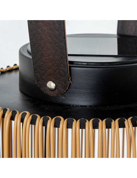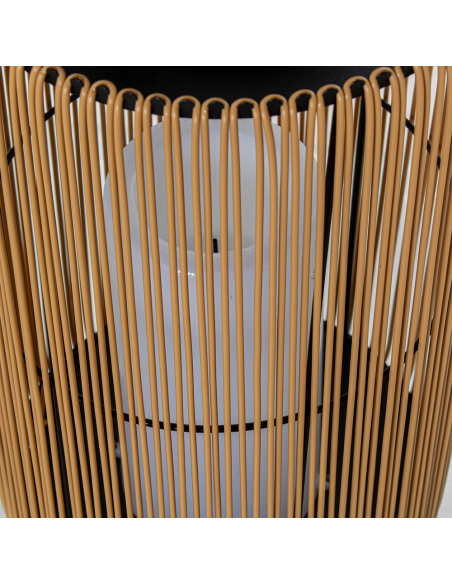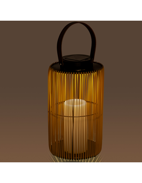Lámpara solar sobremesa/pie luz LED natural, ideal para uso tanto en sobremesa como en pie. Su estructura de polipropileno en color negro y cobertura con delgadas tiras en color natural combinan funcionalidad con estilo contemporáneo. Equipada con iluminación central de luz LED y un panel solar integrado en la parte superior para una eficiencia energética óptima. Incluye un asa de hierro para facilitar su transporte y manejo. Esta lámpara, en elegante tono negro, es la elección perfecta para realzar cualquier espacio, ya sea en interiores o exteriores.