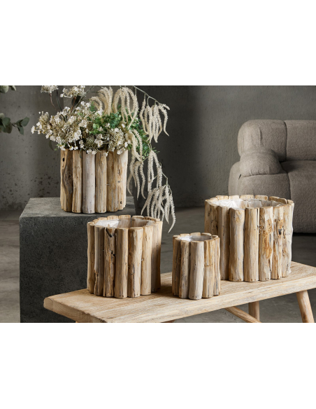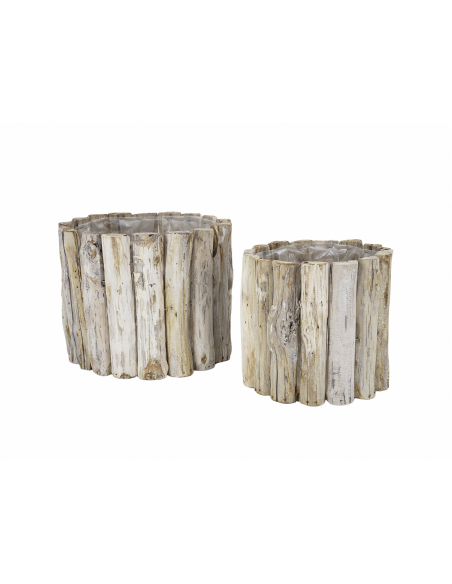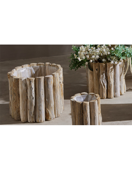 Set 2 maceteros redondo madera 32 Diam., este conjunto de dos maceteros combina la calidez de la madera de castaño con un diseño simple pero elegante, perfecto para realzar la belleza de tus plantas. Su forma redondeada y su acabado natural aportan un toque rústico y acogedor a cualquier espacio. La madera de castaño, conocida por su durabilidad y resistencia, garantiza que estos maceteros serán un complemento duradero en tu hogar. Además, su interior forrado con plástico facilita la plantación y protege la madera de la humedad.