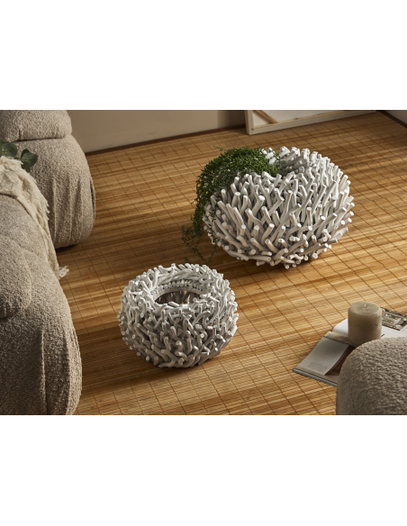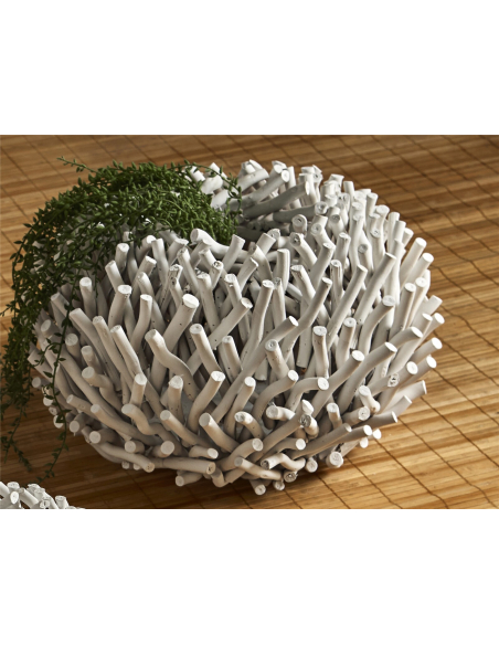 Macetero ramas morera blanco, un macetero que celebra la belleza de la naturaleza en su estado más puro, esta pieza única transformará tu espacio con su presencia orgánica y su diseño rústico. El macetero está elaborado con ramas de morera entrelazadas de forma artesanal, creando una estructura abierta y texturizada que deja entrever el interior. El color blanco aporta calidez y autenticidad, mientras que su forma irregular y su diseño único lo convierten en una pieza escultórica que atrae todas las miradas. Perfecto para colocar en el suelo, sobre una mesa o en un rincón especial, este macetero es una invitación a incorporar la naturaleza a tu hogar de una forma original y sofisticada.