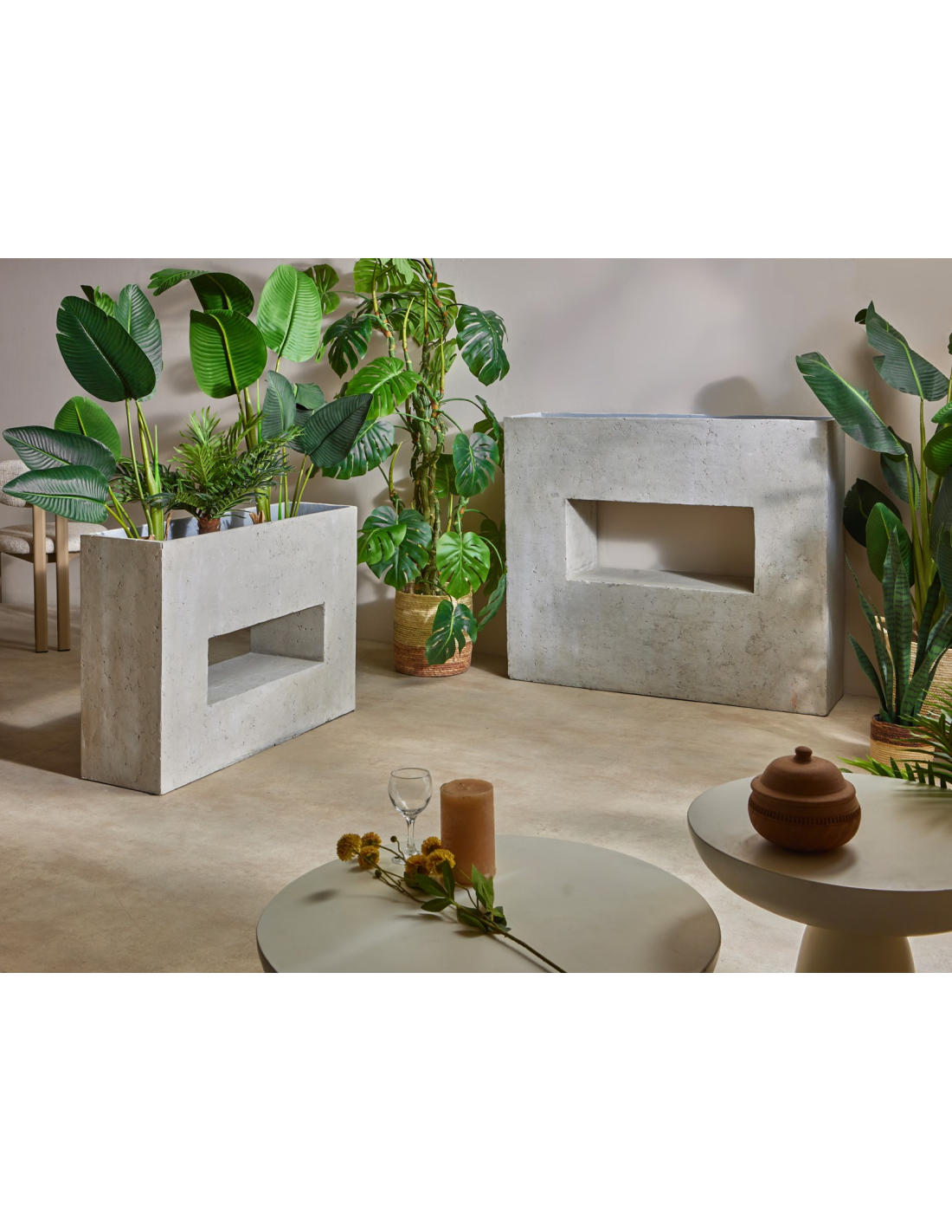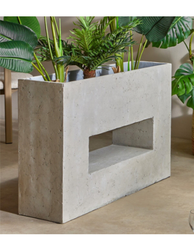 Jardinera-separador Krova 70 cm, jardinera de estilo moderno con función de separador, elaborada en fibrocemento con un acabado que recuerda la piedra natural. Su tamaño compacto de 96 x 26 x 27 cm la hace ideal para crear pequeños rincones verdes en salones, terrazas o pasillos, aportando frescura sin ocupar demasiado espacio. Su diseño sobrio y elegante permite combinarla fácilmente con diferentes tipos de plantas y estilos decorativos, ofreciendo versatilidad y un aire sofisticado. Perfecta para quienes buscan integrar naturaleza en el hogar de forma estética y funcional.
